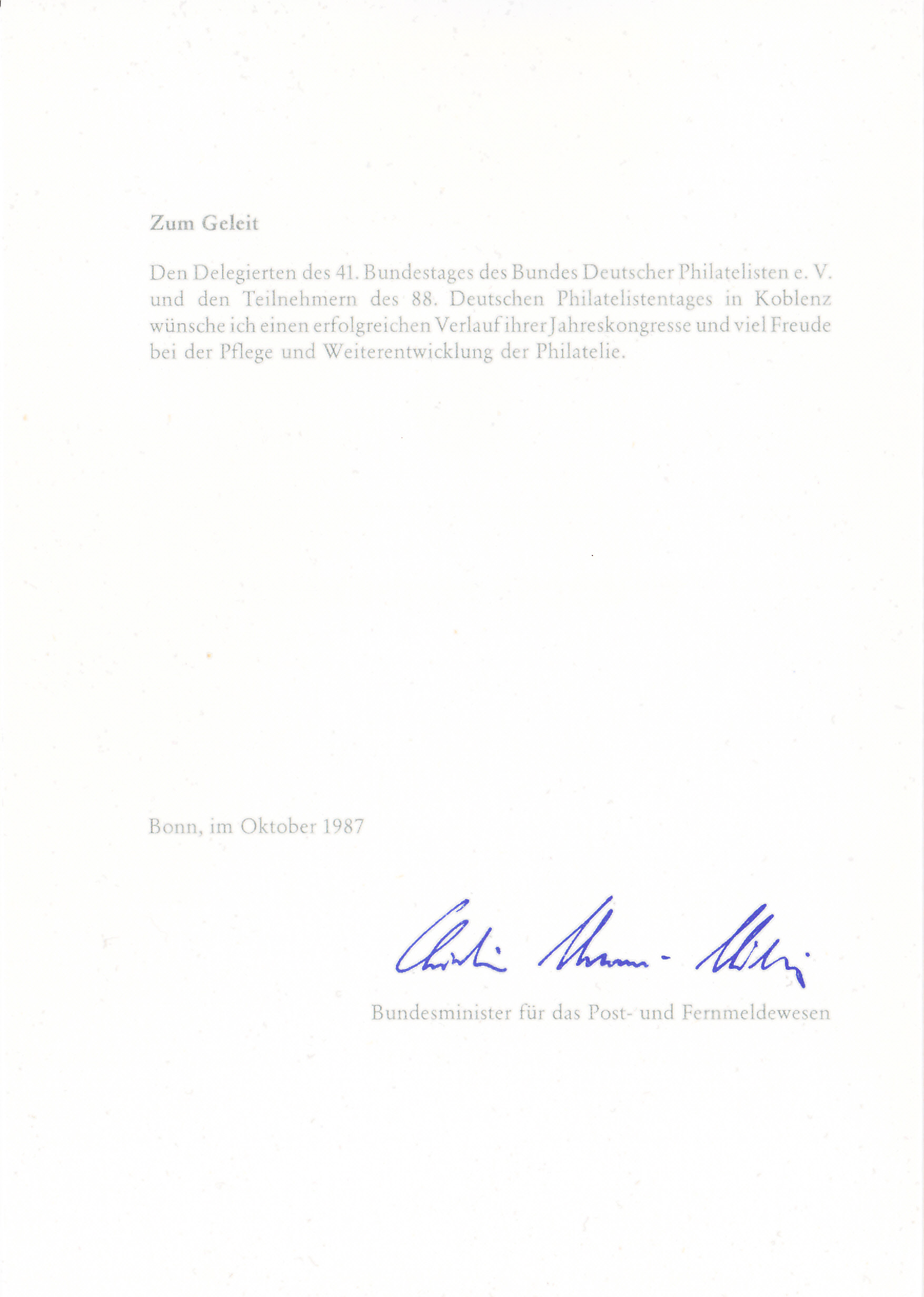 In der Klappkarte des Bundesministers für das Post- und Fernmeldewesen zum 41.Bundestag des BDPh e.V. und zum 88. Deutschen Philatelistentag in Koblenz wurde die Marke zum Tag der Briefmarke als waagerechtes Paar verklebt und mit dem Ersttagsonderstempel Bonn gestempelt.