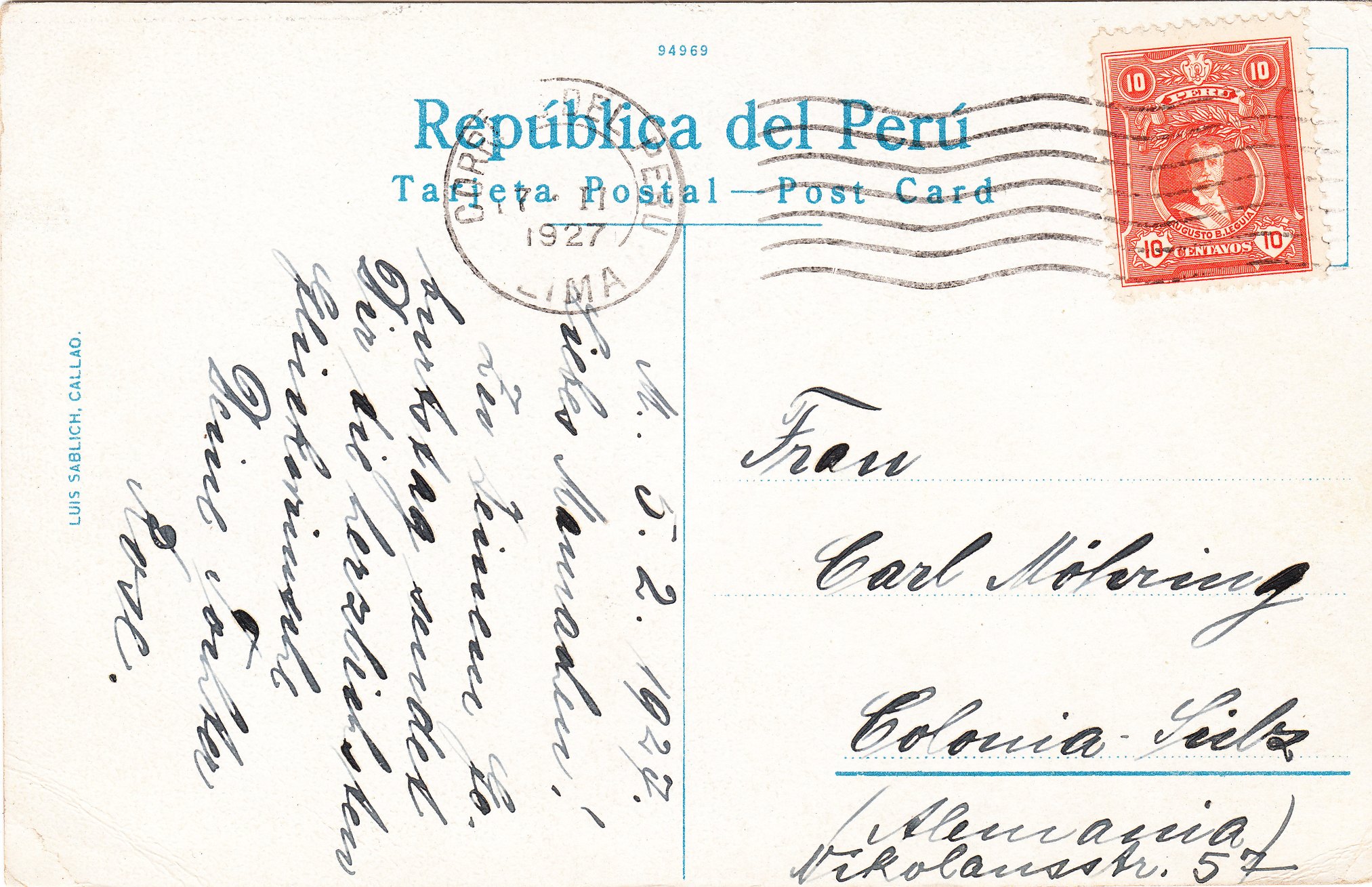 Diese Ansichtskarte wurde am 05.02.1927 in Lima, der Hauptstadt von Peru, geschrieben: