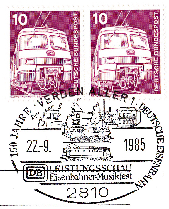 Sonderstempel zu einer Leistungsschau und Eisenbahner Musikfest aus Anlass "150 Jahre Deutsche Eisenbahn" vom 22.9.1985 aus Verden, Aller 1.