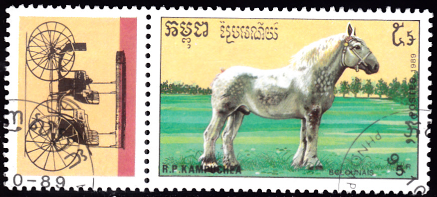 In der gleichen Serie aus Kambodscha gibt es eine Marke (MiNr 1057) mit einem Kaltblut-Pferd der Rasse Boulonnais.