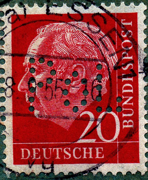 POL-Lochungen der Dauerserie Heuss gab es von den Polizeibehörden in Essen (bis 1956) und Oberhausen (bis 1965). Sie unterscheiden sich insbesondere durch die Größe des "O". Da die Marken in der Zähnung vor Lochung gefaltet wurden kann man mehrere Stellungen der Lohung unterscheiden.