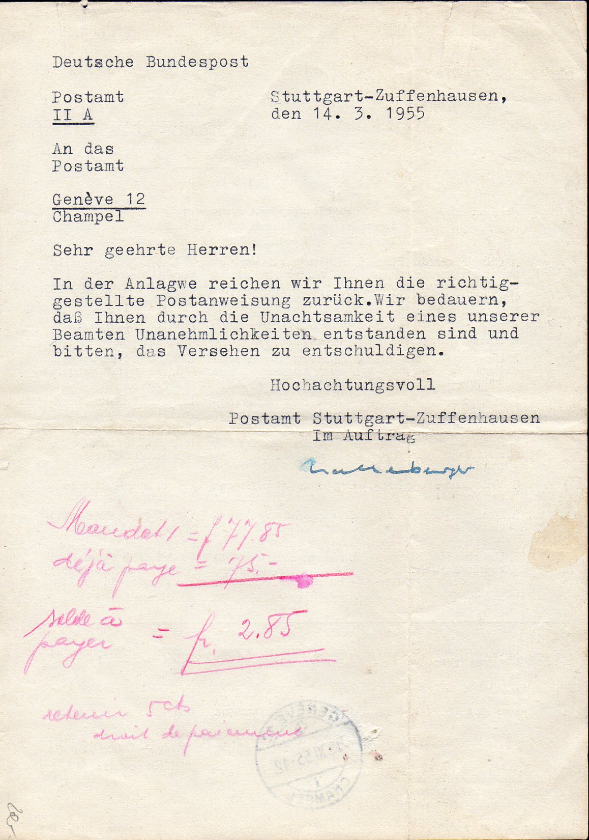 2 Tage später bemängelte das Postamt Genf, dass die Angabe des Betrages in Schweizer Franken fehlt und sandte die Postanweisung mit einem entsprechenden Begleitschreiben nach Stuttgart zurück.