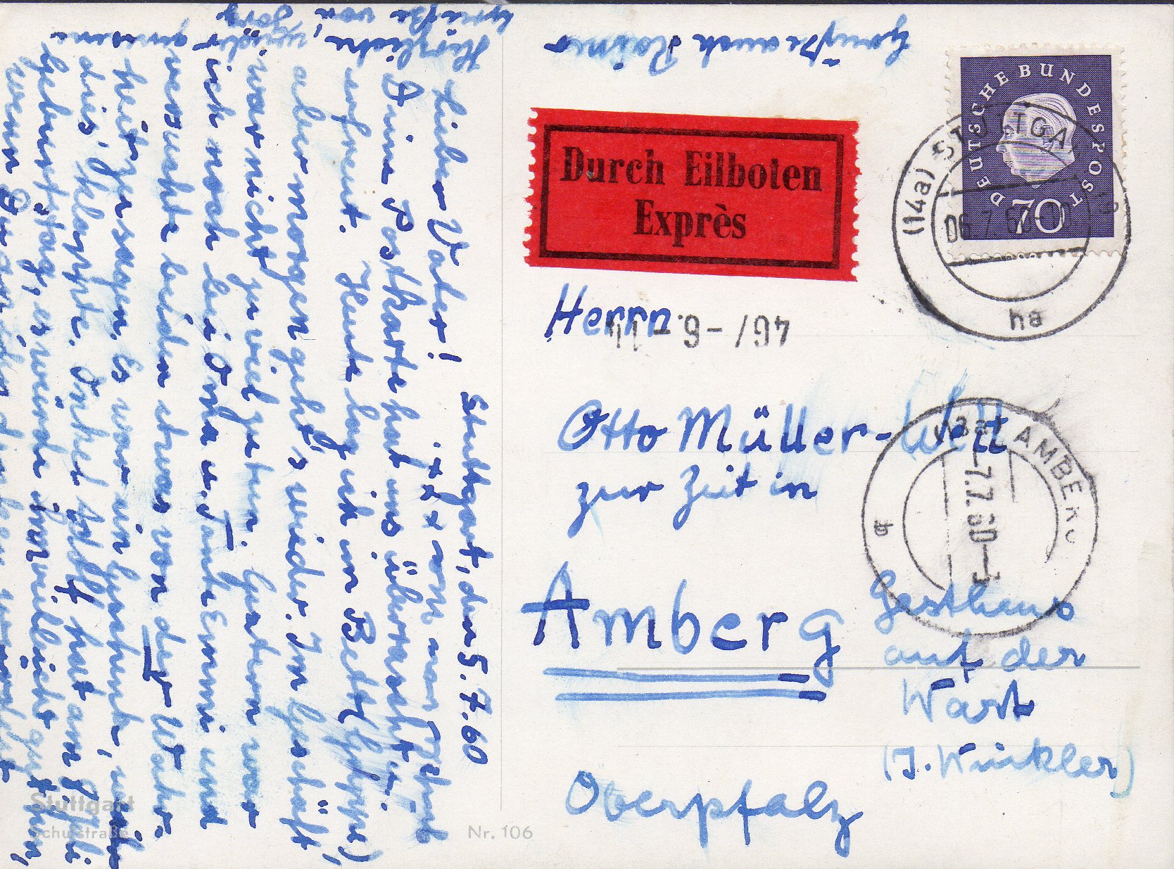 Postkarte mit Zusatzleistung "Durch Eilboten" von Stuttgart nach Amberg