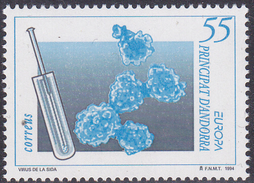 In Andorra erschien bei der spanischen Post eine Europamarken 1994 zum Gemeinschaftsthema "Entdeckungen und Erfindungen" mit einem Reagenzglas mit Pipette und Aidsviren (Entdeckung des Aidsvirus).