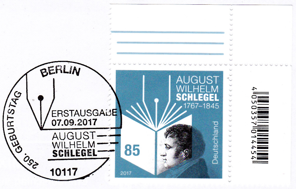 Zu seinem 250. Geburtstag erschien bei der Deutschen Post eine Marke mit seinem Porträt vor einem aufgeschlagenen Buch. Hier ein Eckrandstück mit EAN-Code.
