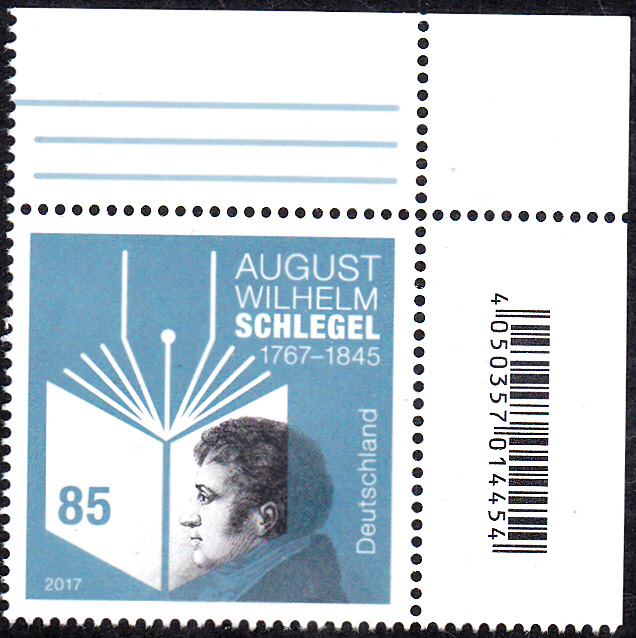 Zu seinem 250. Geburtstag erschien bei der Deutschen Post eine Marke mit seinem Porträt vor einem aufgeschlagenen Buch. Hier ein Eckrandstück mit EAN-Code.