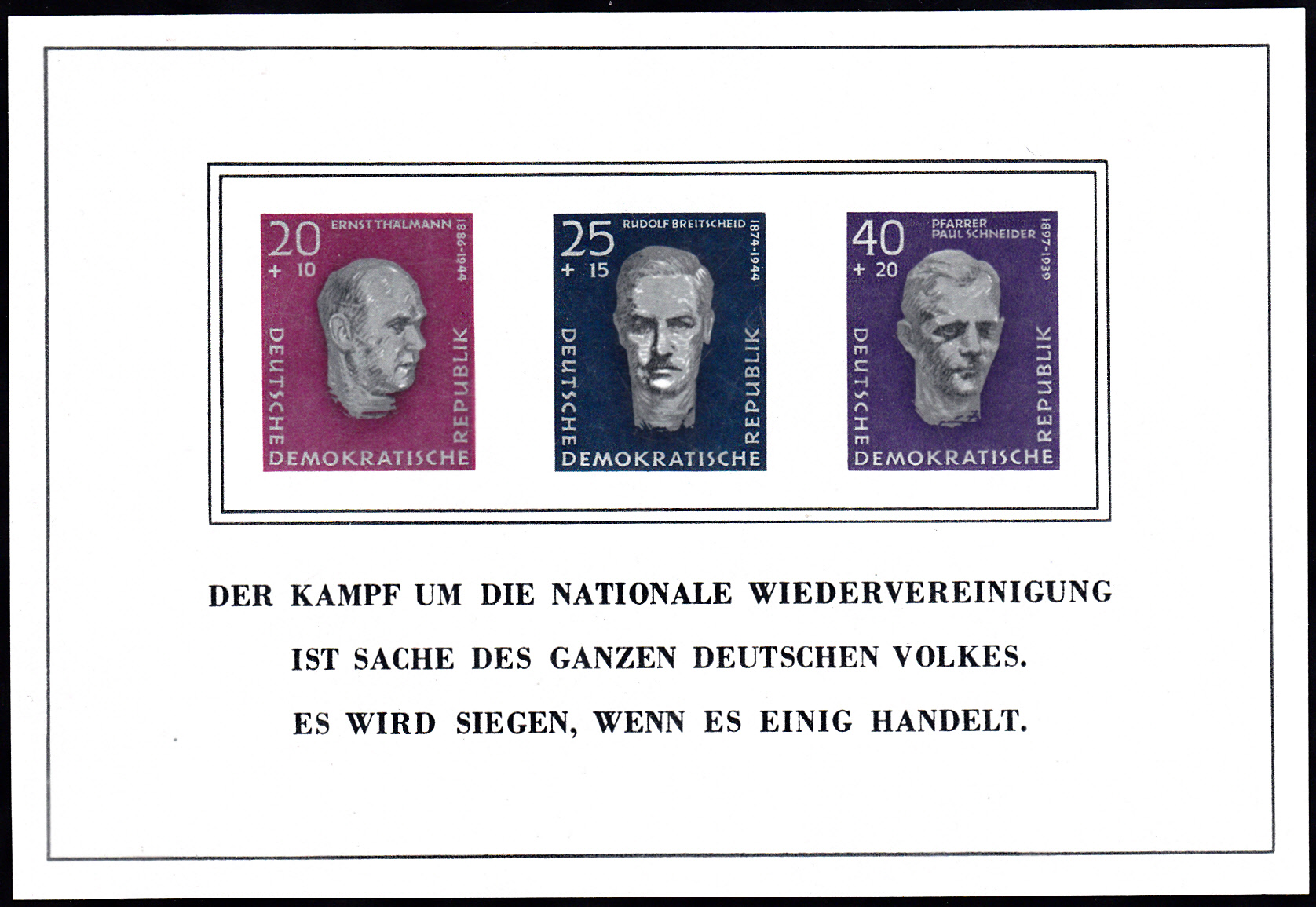 Zur Einweihung der Nationalen Gedenkstätte Buchenwald erschien auch noch ein Block (MiNr Block 15), der drei Marken enthält (MiNr 606 B bis 608 B) mit den Porträts von drei Opfer aus dem KZ Buchenwald (Ernst Thälmann, Rudolf Breitscheid und Pfarrer Paul Schneider).