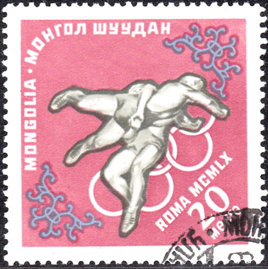 Diese Marke aus einer Serie der Mongolei zu den Sommerspielen 1960 (MiNr 195) zeigt einen Ringkampf.