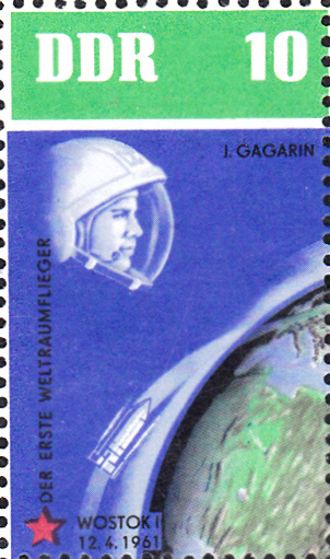 Auf einer Marke aus der Ausgabe "5 Jahre sowjetische Weltraumflüge" der DDR (MiNr 927) sind der Kosmonaut Juri Gagarin und Wostok 1 abgebildet.