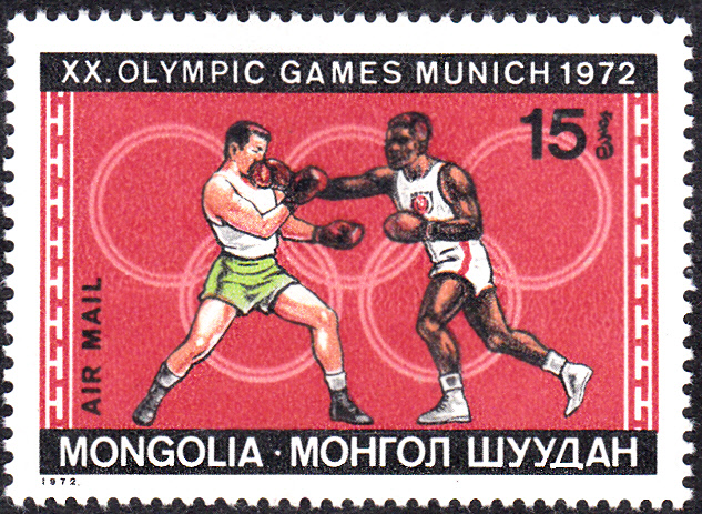 Eine Marke aus der Serie der Mongolei zu den Olympischen Spielen 1972 in München (MiNr 703) zeigt im Markenbild zwei Boxer beim Kampf.