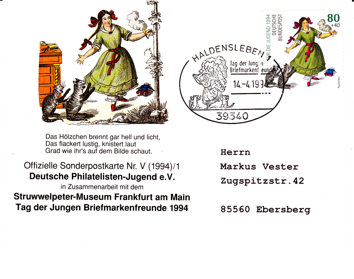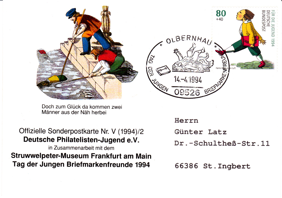 3. Bild im Sonderstempel aus Rödermark zum Tag der Jungen Briefmarkenfreunde am Ersttag der Markenserie.