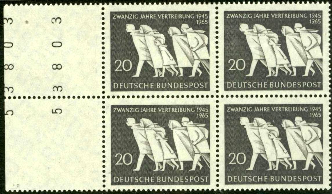 Während meines Urlaubs hatte ich ein Treffen mit befreundeten Sammlern in Süddeutschland. Ein Sammlerfreund brachte mir einen Viererblock der Mi.Nr. 479 "20 Jahre Vertreibung" mit, welcher eine doppelte Bogenzählnummer am linken Rand aufweist. Solche Stücke sieht man auch nicht häufig und so war die Freude meinerseits natürlich riesig! Entstanden ist das Ganze durch fehlerhaften Bogenschnitt. Die linke Nummer gehört schon zum Nachbarbogen, somit hat der keine Zählnummer abbekommen, da immer nur mittig zwischen 2 Druckbogen die Nummer angebracht ist.
