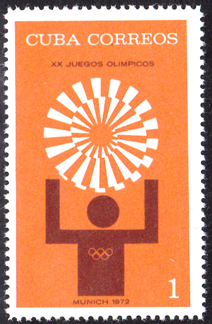 Diese Marke aus der kubanischen Serie (MiNr 1790) zu den Spielen in München zeigt einen Sportler der die Olympiaspirale trägt.