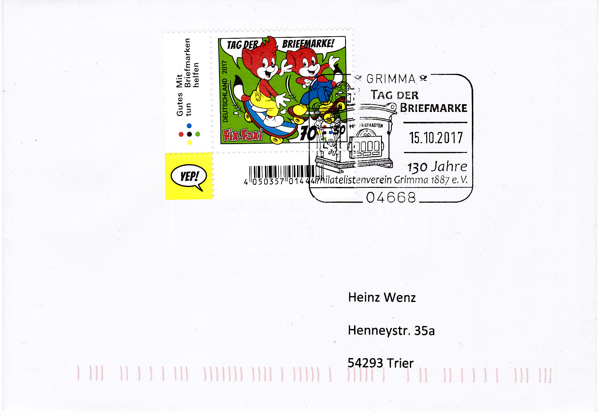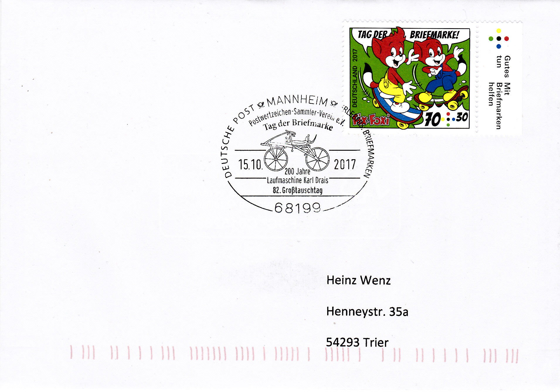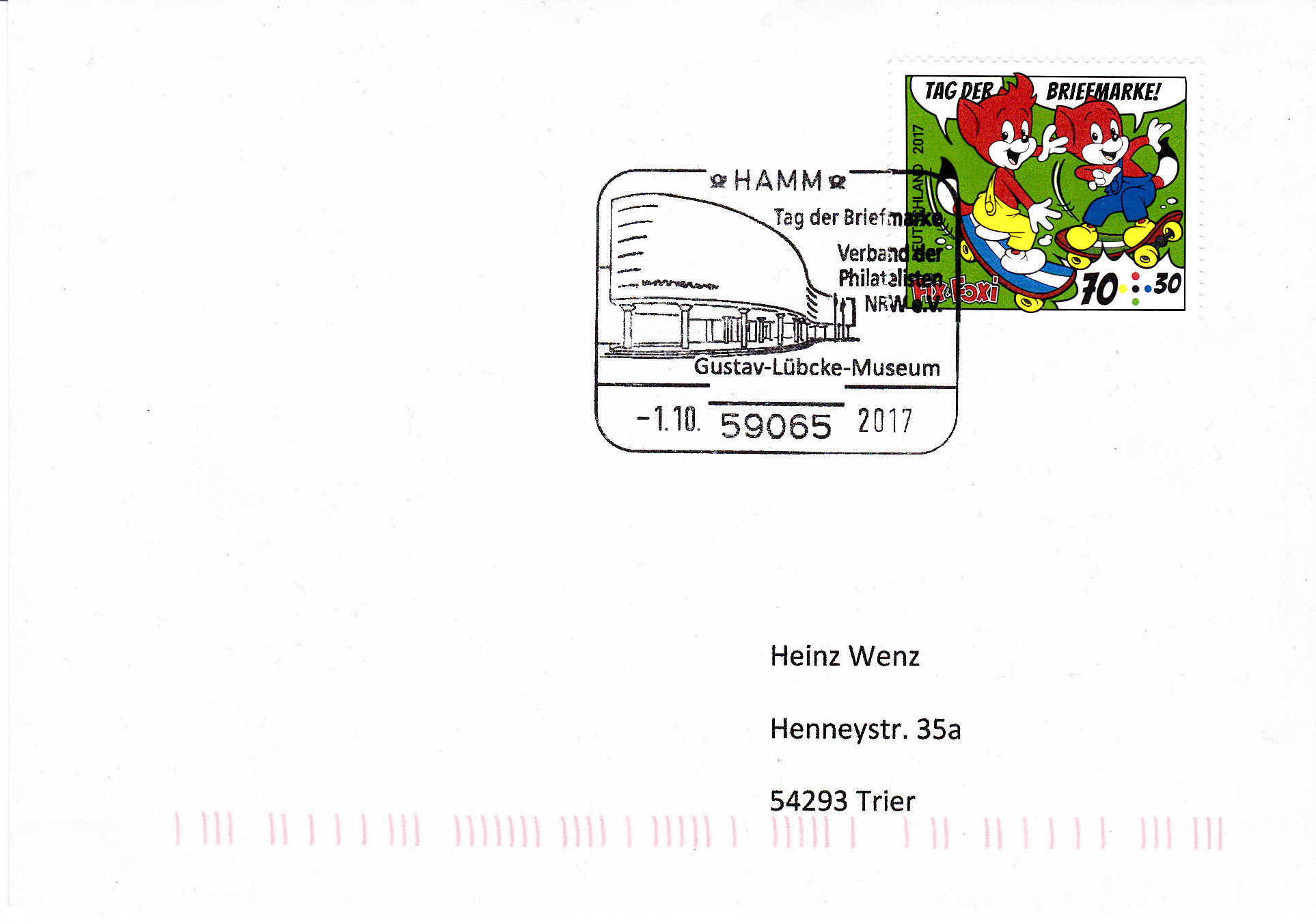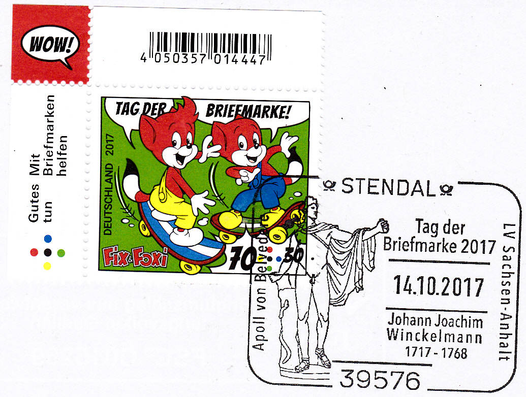 Der Sonderstempel zum Tag der Briefmarke 2017 des Landesverbandes Sachsen-Anhalt vom 14.10.2017 aus Stendal erinnert auch an Johann Joachim Winkelmann (geb. 9. Dezember 1717 in Stendal; gest. 8. Juni 1768 bei Triest, deutscher Archäologe, Bibliothekar, Antiquar und Kunstschriftsteller der Aufklärung). Für Winckelmann war der im Stempelbild gezeigte Apollo von Belvedere "das höchste Ideal der Kunst unter allen Werken des Altertums".