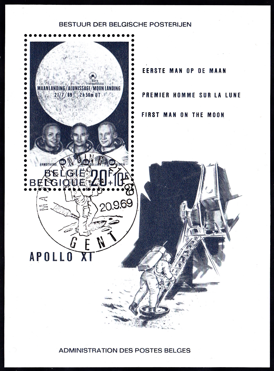 In Belgien ist zur ersten bemannten Mondlandung - Apollo 11 eine Marke (MiNr 1565) mit der Mondoberfläche mit Einzeichnung des Landeplatzes und den Astronauten Armstrong, Collins und Aldrin erschienen.