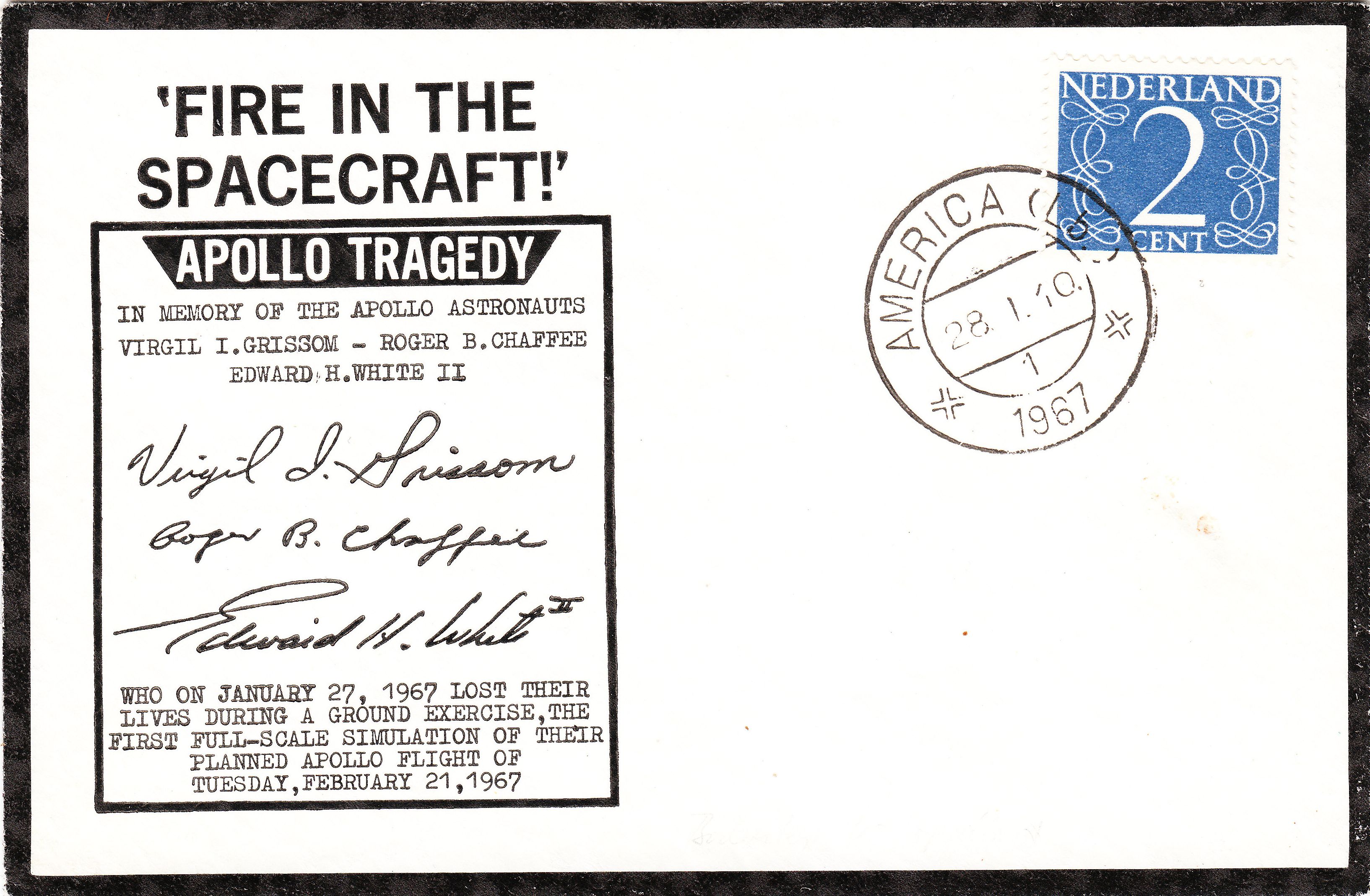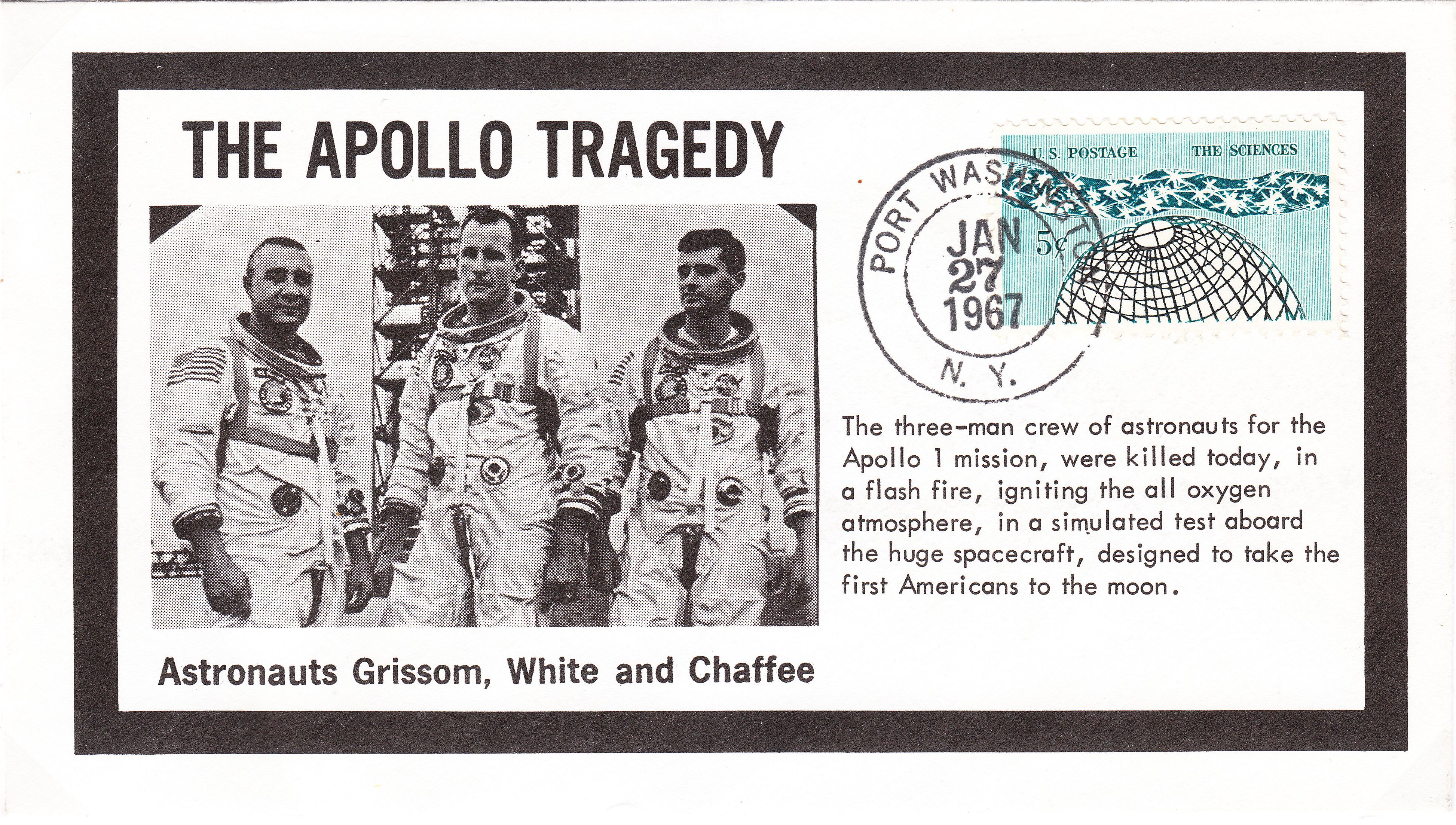 Noch am Unglückstag, dem 27.01.1967, wurde in PORT WASHINGTON N. Y. dieser Beleg zur Dokumentation der Tragödie aufgelegt: