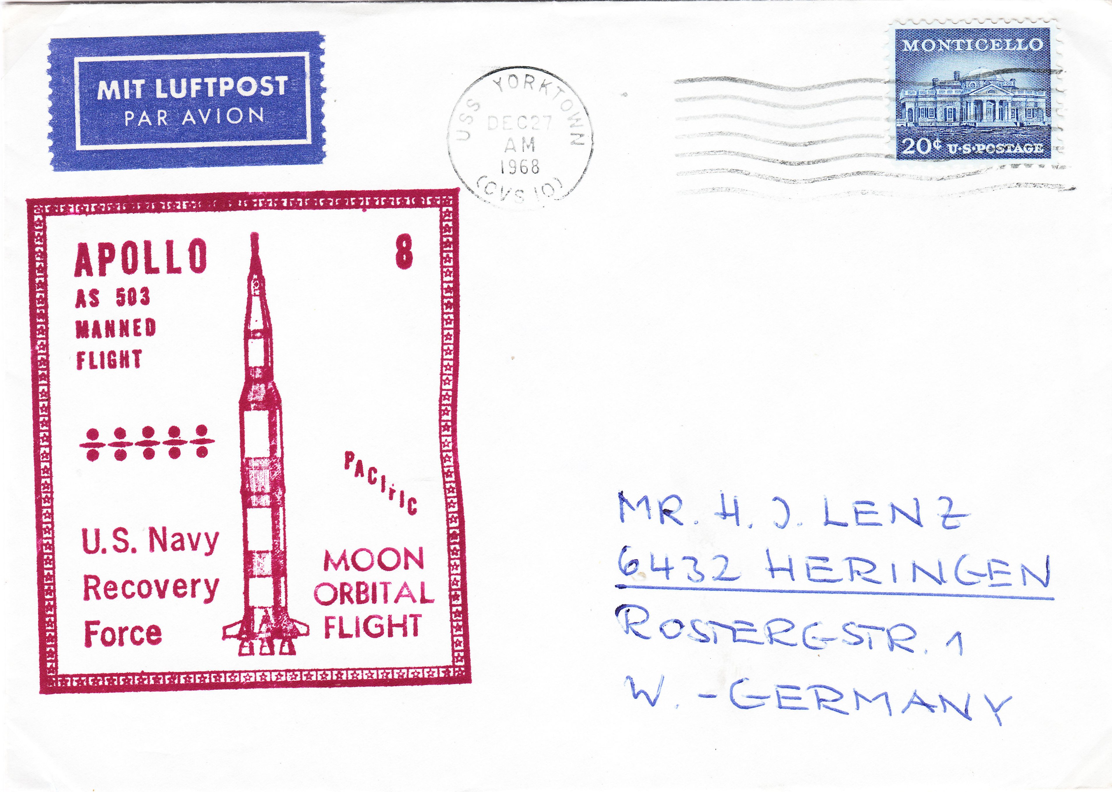 Dieser Beleg dokumentiert die erfolgreiche Landung von APOLLO 8 am 27.12.1968 sowie die Bergung durch den Flugzeugträger USS YORKTOWN (CVS-10):