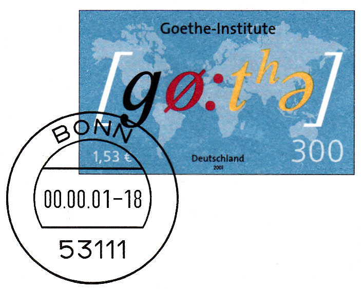 Dieser Umschlag mit Wertstempel "Goethe-Institut" (wie Marke MiNr 2181) mit Rahmen und mit Vorausentwertung "BONN/ 00.00.04-18 / 53111" ist unter der MiNr EA E1/01 zu finden. Es ist hier nur der obere Teil der C4-Versandtasche abgebildet, der unter Teil ist nicht bedruckt und hier wird nicht abgebildet.