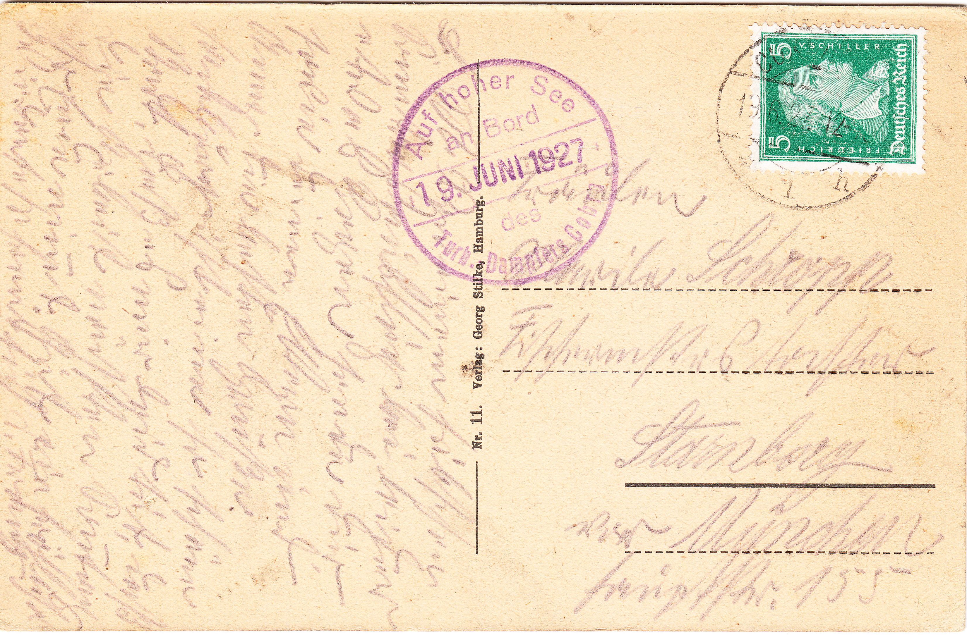 Hier eine Postkarte im Fernverkehr, am 19.06.1927 ausgegeben an Bord des Turbinendampfers COBRA auf dem Weg von Helgoland nach Cuxhaven, wo der Beleg dann der Deutschen Reichspost zur weiteren Beförderung übergeben wurde: