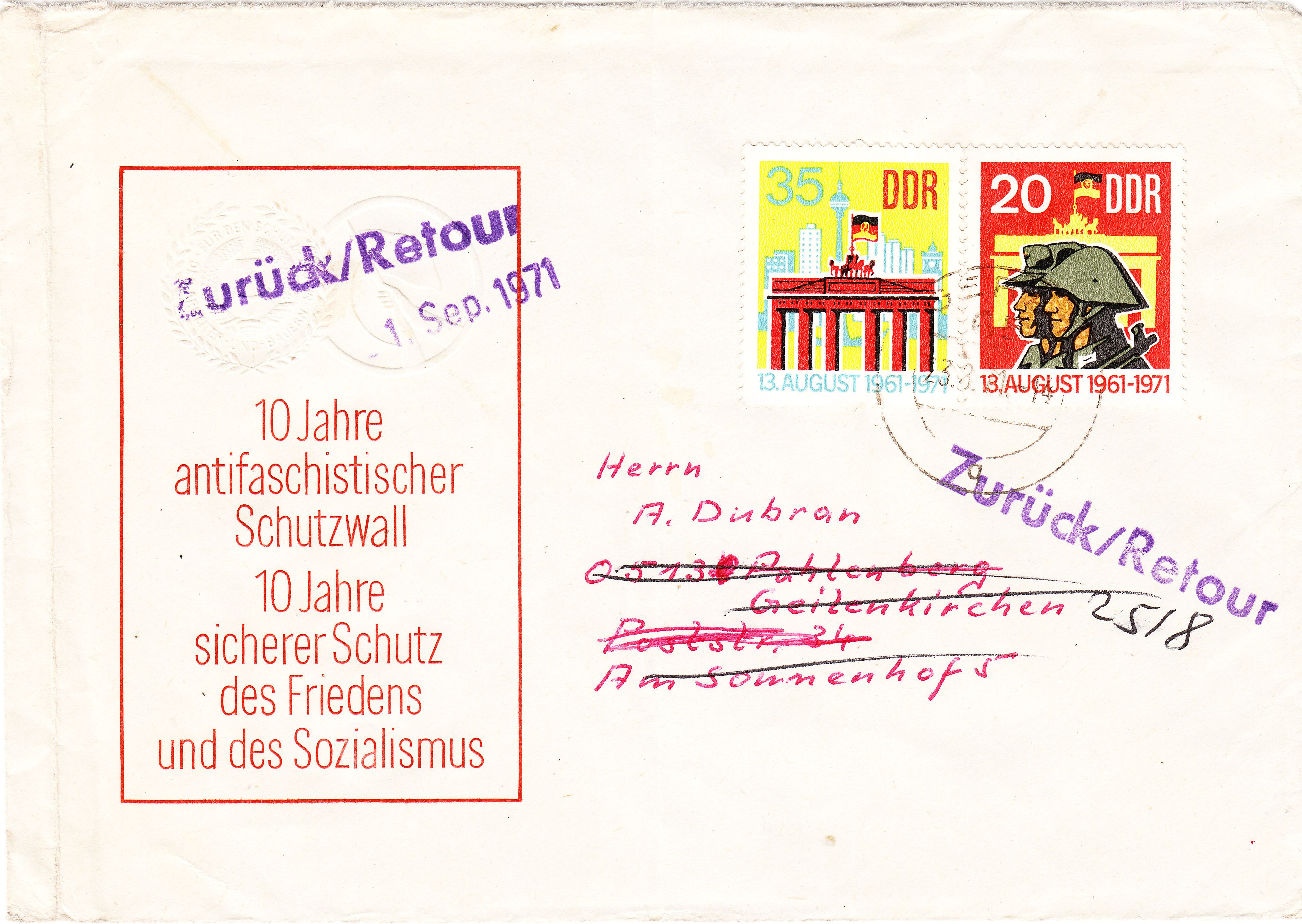 Als 1971 aus der DDR Briefe mit offiziellen Schmuckumschlägen zu den DDR-Markenausgaben „10 Jahre Antifaschistischer Schutzwall“, „Mahnmal Wiltz“ und „Unbesiegbares Vietnam“ nach Westdeutschland versandt wurden, schickte sie die Deutsche Bundespost an die Absender zurück. Hierbei handelte es sich nicht um einen Postkrieg im eigentlichen Sinne, da nicht die Briefmarken beanstandet wurden, sondern die Bedruckung der Umschläge: