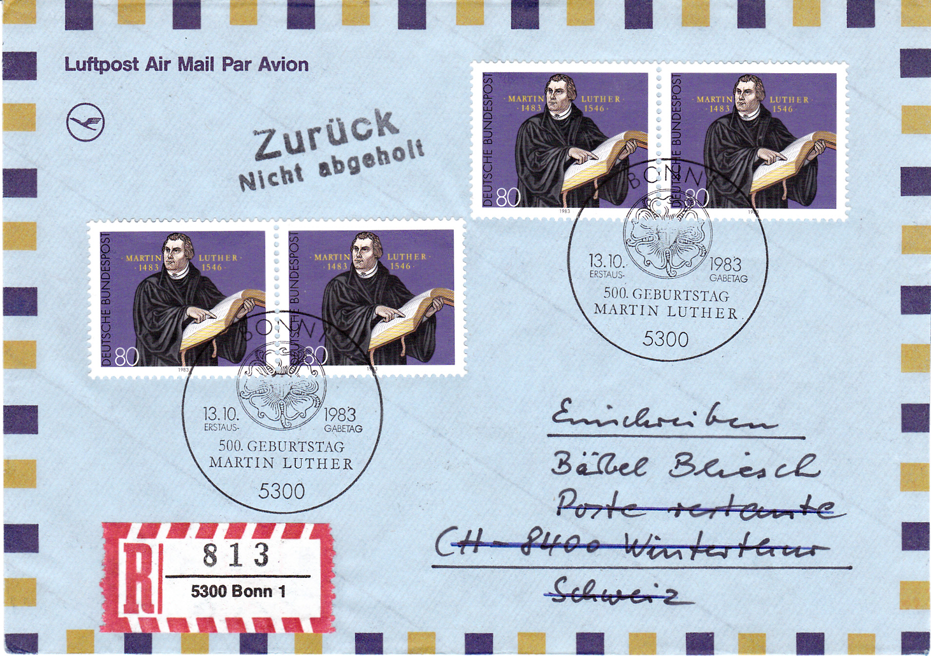 Im Stempelbild des Ersttagsonderstempels zu der Marke der Deutschen Bundespost aus dem Jahre 1983 zum 500. Geburtstag von Martin Luther (MiNr 1193) ist ebenfalls eine Lutherrose zu sehen.