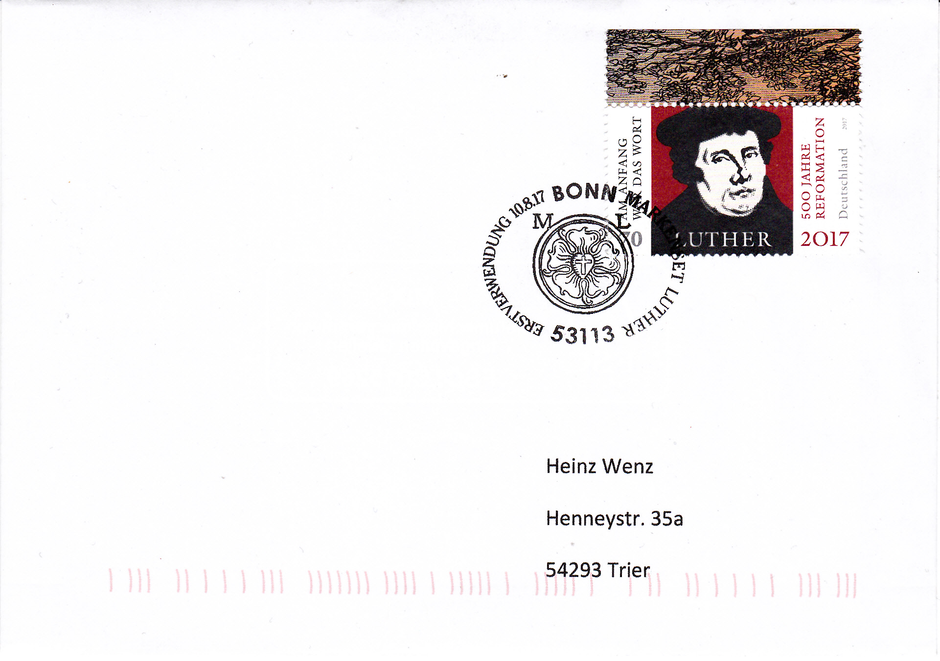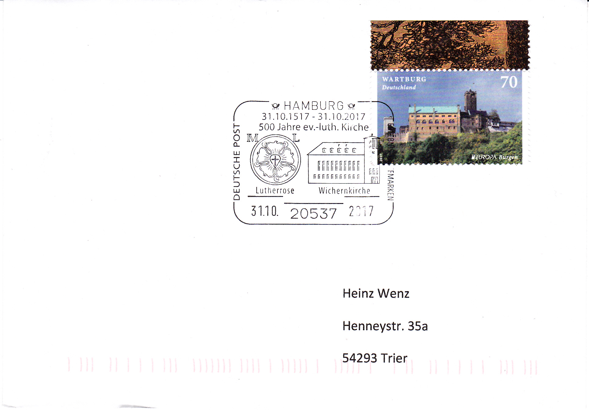 Im Sonderstempel aus Hamburg vom 31.10.2017 ist auch eine Lutherrose zu sehen.