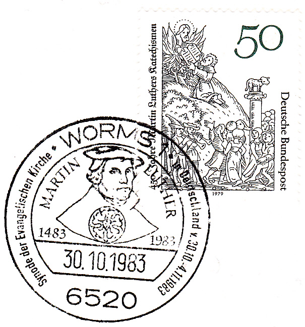 In diesem Sonderstempel aus Mainz vom 30.10.1983 zur Synode der Evangelischen Kirche ist auch eine Lutherrose zu sehen.