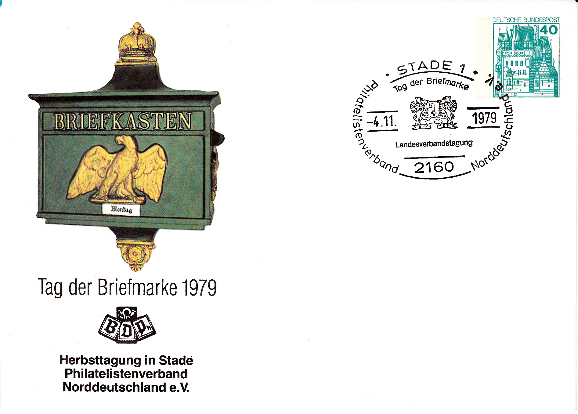 Ganzsachenumschlag zum Tag der Briefmarke 1979 mit dem Sonderstempel des LV Südwestdeutscher Briefmarkensammlervereine e.V. zum TdB 1979 vom 4.11.1979 aus Dettingen an der Erms.