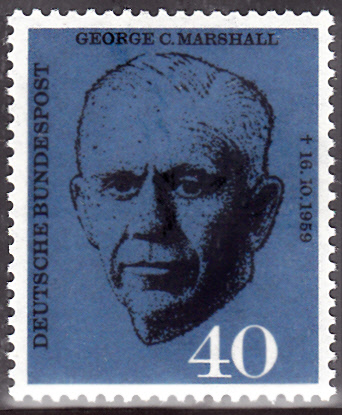 Zum 1. Todestag von George C. Marshall erschien bei der Deutschen Bundespost am 15.10.1960 diese Marke (MiNr 344) seinem Porträt.