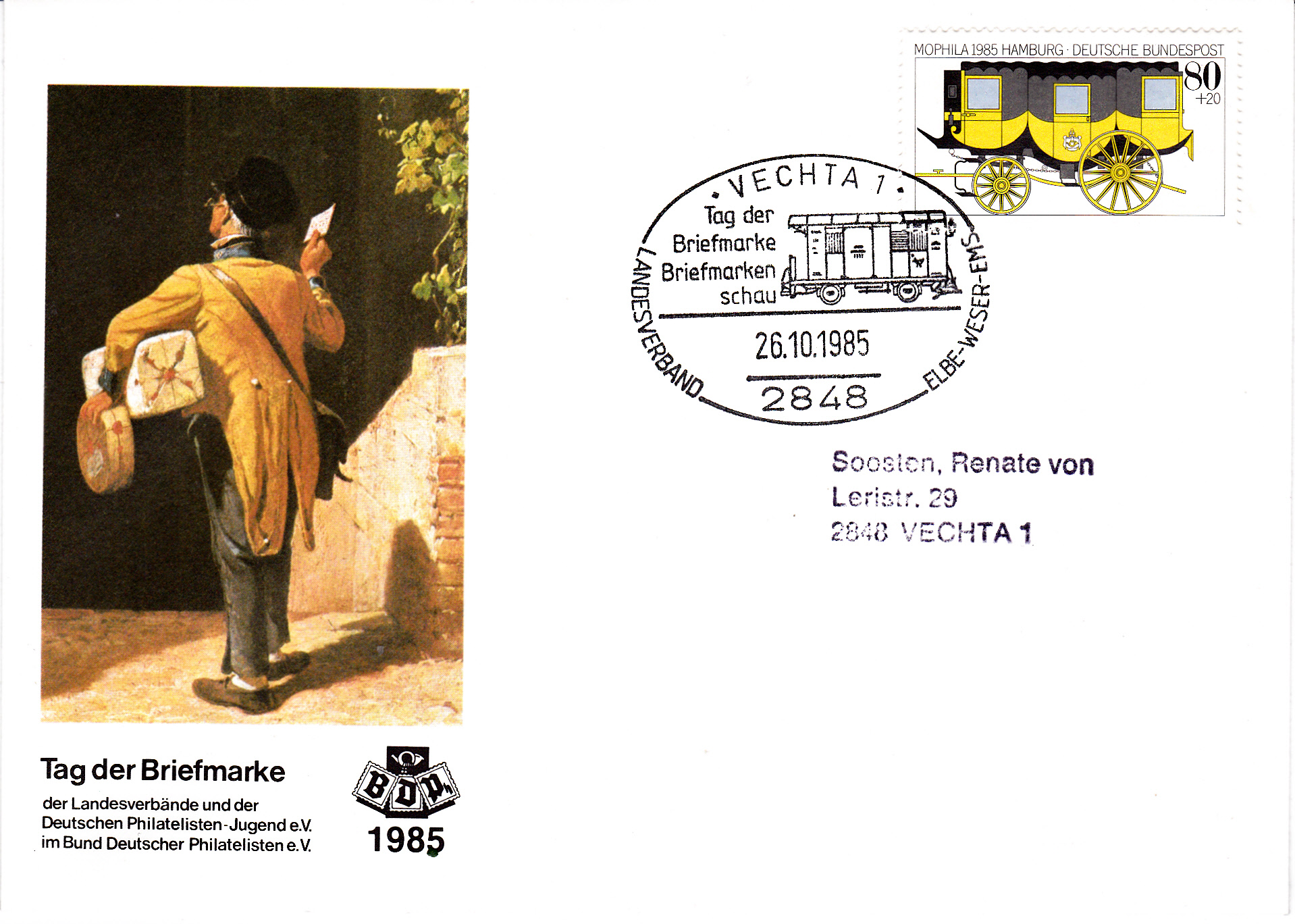 Sonderstempel des Landesverbandes Elbe-Weser-Ems e.V. zum Tag der Briefmarke 1985 vom 27.10.1985 aus Vechta auf einem Sonderumschlag.
