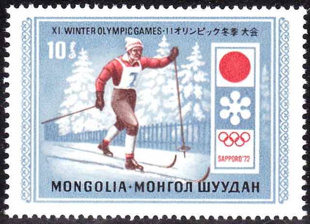 In der Serie aus der Mongolei zu den Spielen in Sapporo zeigt auch eine Marke (MiNr 667) einen Skilangläufer.