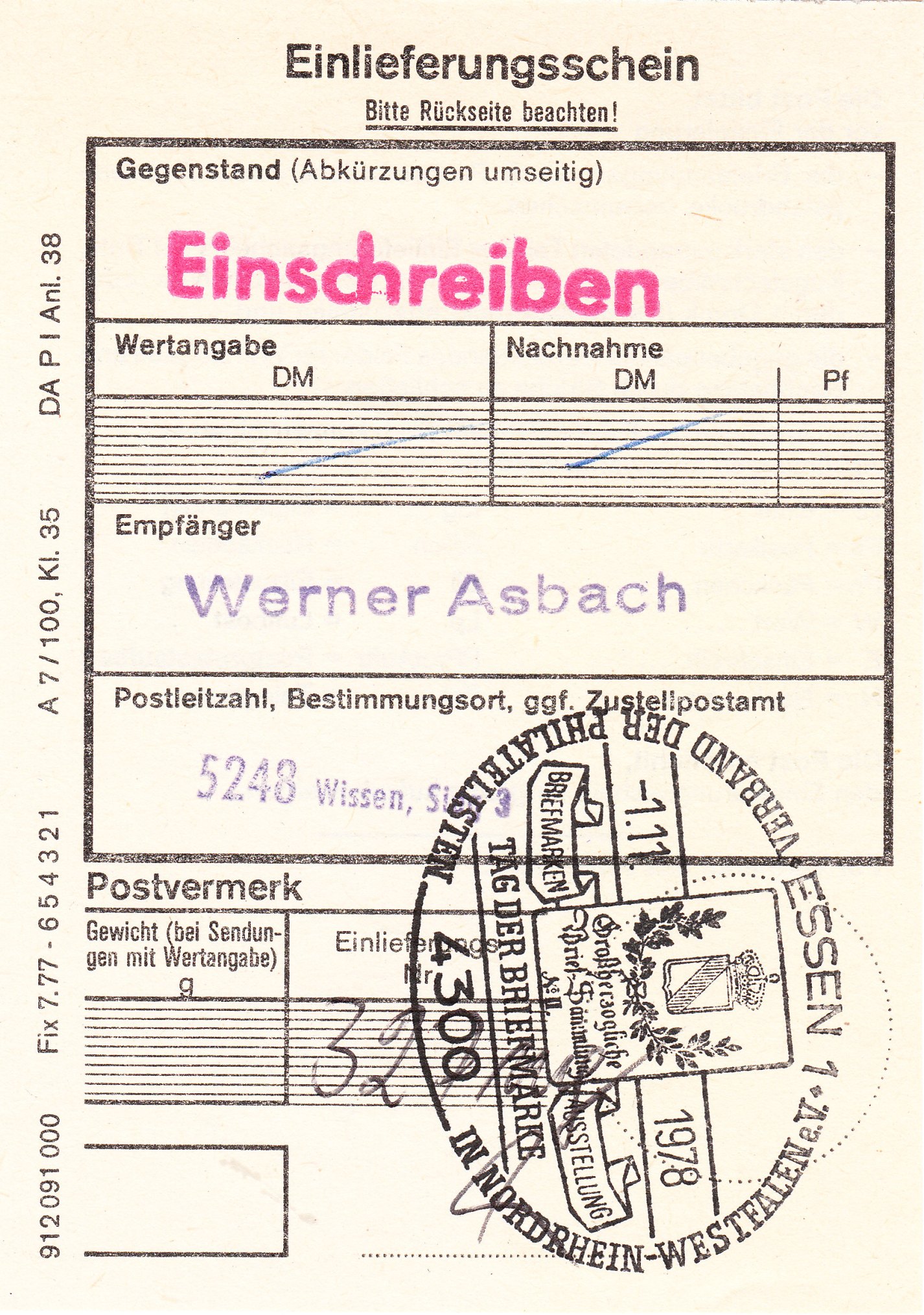 Am 01.11.1978 fand in Essen eine Briefmarkenausstellung zum "TAG DER BRIEFMARKE" statt. Dabei wurde dieser Sonderstempel eingesetzt, der als Motiv das Posthausschild aus dem Jahre 1844 aus Baden zeigt, das auch als Motiv für die am 12.10.1978 erschienene Sondermarke MiNr. 980 gedient hatte:
