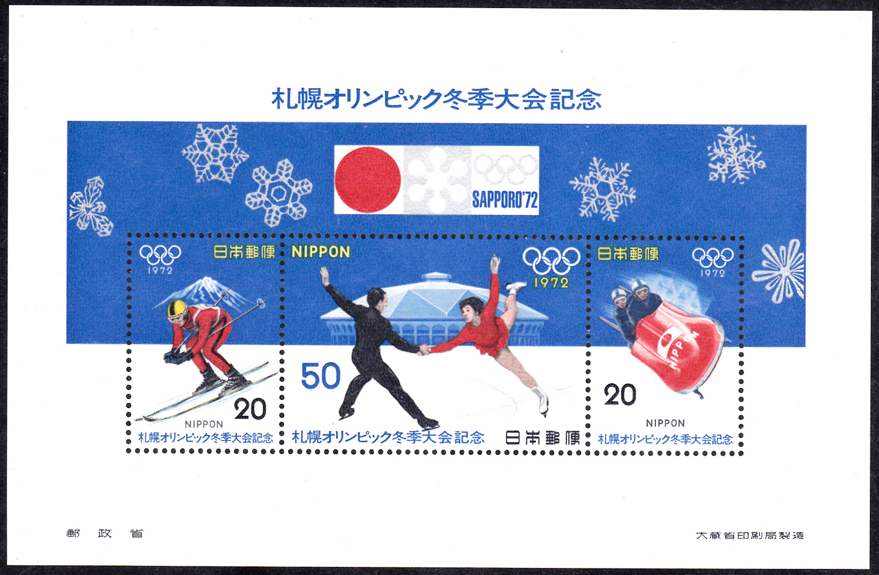 In der Serie aus der Mongolei zu den Spielen in Sapporo zeigt eine Marke (MiNr 672) einen Abfahrtsläufer.