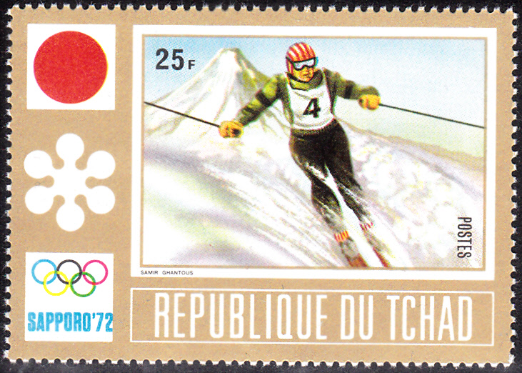 Aus dem Tschad kommt diese Marke (MiNr 502 A) mit einem Abfahrtsläufer.