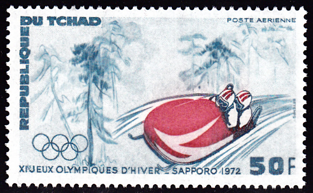 Im Tschad ist zu den Winterspielen 1972 diese Marke (MiNr 486) mit einem Zweierbob mitten im Urwald erschienen.