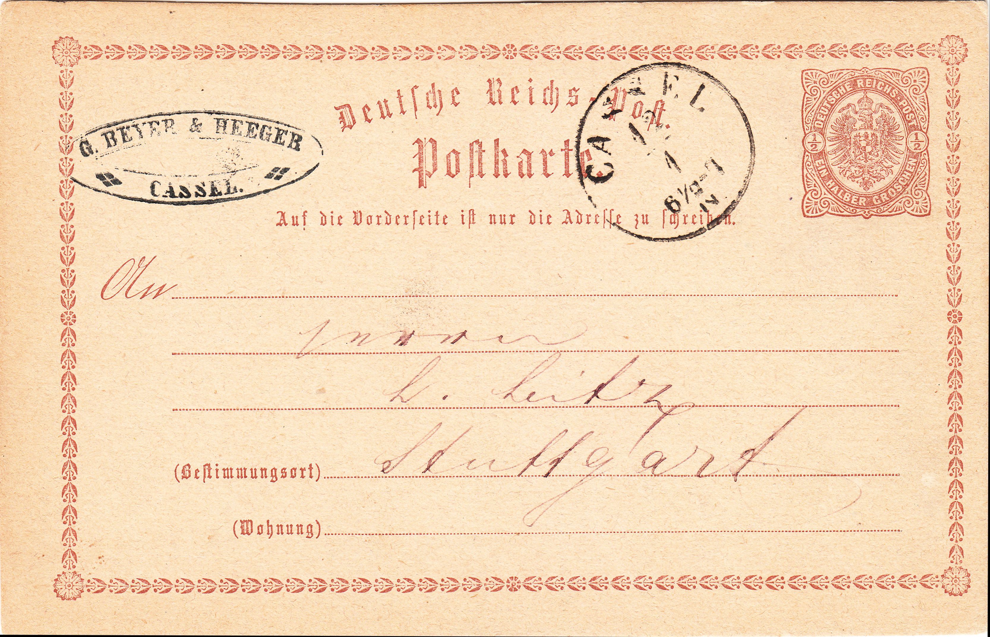 Diese Ganzsache MiNr. P 1 wurde am 12.01.1875, also in der Anfangszeit der Pfennigwährung, entwertet per nachverwendetem Thurn & Taxis Kreisstempel "CASSEL":