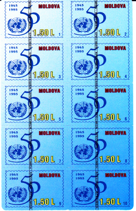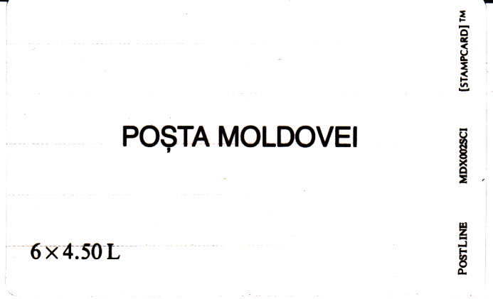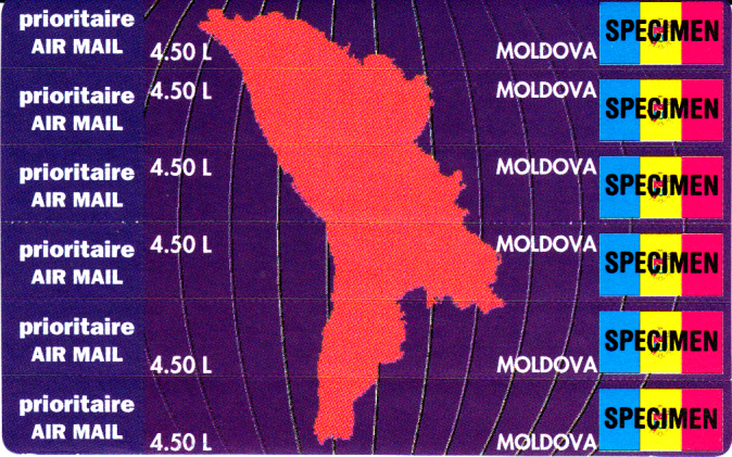 Bereits am 22.12.1994 verausgabte Moldawien die ersten Stampcards mit der Abbildung einer Landkarte Moldawiens und der Flagge (MiNr 139-144). Die 6 waagerechten Markenstreifen sind selbstklebend und auf einem Träger aufgebracht. Links von jeder Marke befindet sich ein abtrennbares Feld mit Angabe der Versendungsart "prioritaire AIR MAIL". Beim hier gezeigten Exemplar handelt es sich um eine Musterkarte, erkennlich am Aufdruck "Specimen" über den Flaggen der Marken. Die Machart der Stampcard ist ähnlich der von mir unter Korea-Nord eingestellten Stampcard.