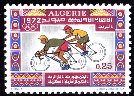 Auch in Algerien ist eine Serie mit vier Marken erschienen. Hier die erste Marke (MiNr 583) mit zwei Radrennfahrer.