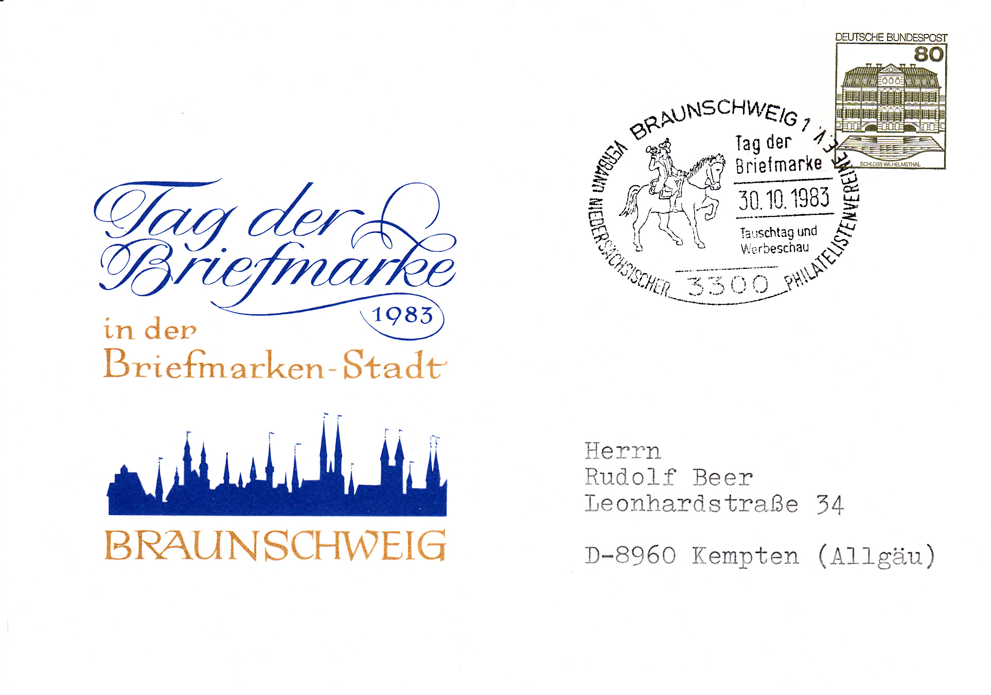 Diese Ganzsache zum Tag der Briefmarke in Braunschweig wurde auch mit dem Sonderstempel aus Braunschweig zum Tag der Briefmarke am 30.10.1983 abgestempelt.