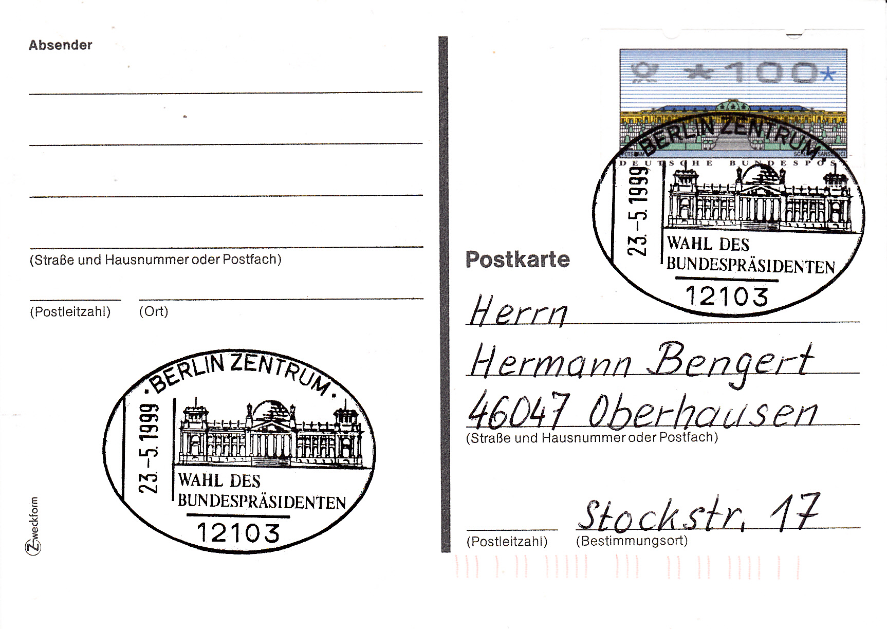 Die 11. Bundesversammlung fand am 23. Mai 1999 im Reichstagsgebäude in Berlin statt. Diese Wahl gewann Johannes Rau im zweiten Wahlgang mit 51.6% der Stimmen. Zur gab es in Berlin am 23.5.1999 einen Sonderstempel mit dem Reichstagsgebäude.