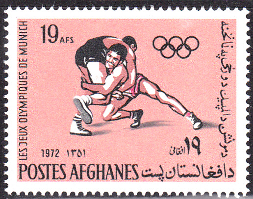 Zwei bildgleiche Marken aus einer Serie Afghanistans zu den Spielen in München zeigen zwei Ringer beim Kampf am Boden.