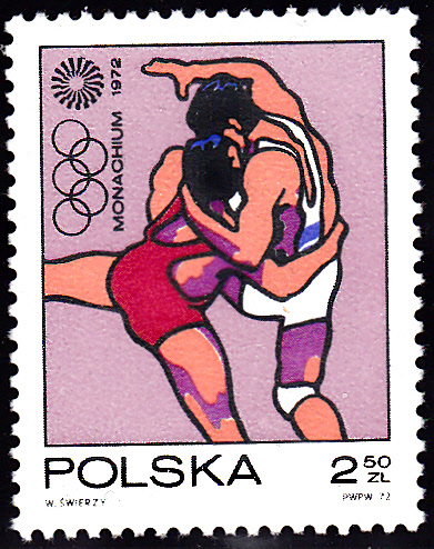 Auf dieser Marke (MiNr 2153) aus der Serie Polens zu den Olympischen Spielen 1972 wird eine Szene beim Ringen dargestellt.
