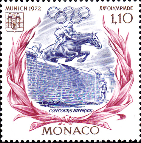 Aus Monaco waren fünf Teilnehmer/-innen bei den Wettbewerben in München vertreten. Die Marken Monacos zu den Spielen in München zeigen Motive zum Pferdesport. Hie eine Marke (MiNr 1045) mit einem Dressurreiter.