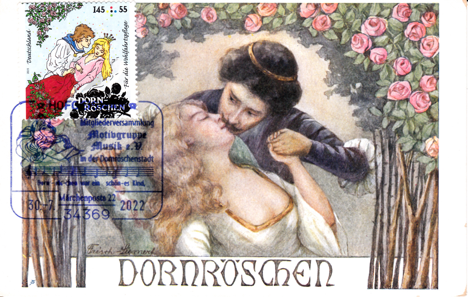 Sonderstempel vom 30.7.2022 aus Hofgeismar zur Mitgliederversammlung der Motivgruppe Musik e.V. bei der Briefmarkenausstellung "Märchenposta 2022". Im Stempelbild ist das schlafende Dornröschen abgebildet und der Anfang des Kinderliedes "Dornröschen war ein schönes Kind" in Noten und Text.