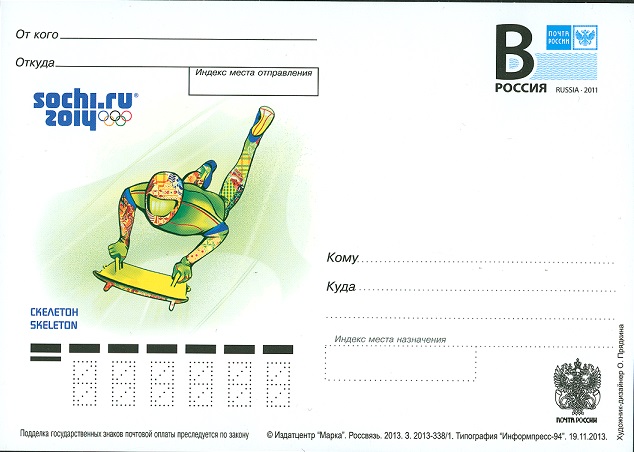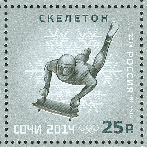 Auf einer russischen Marke zu den Olympischen Spielen 2014 in Sotschi ist so ein Sceletonsportler dargestellt.