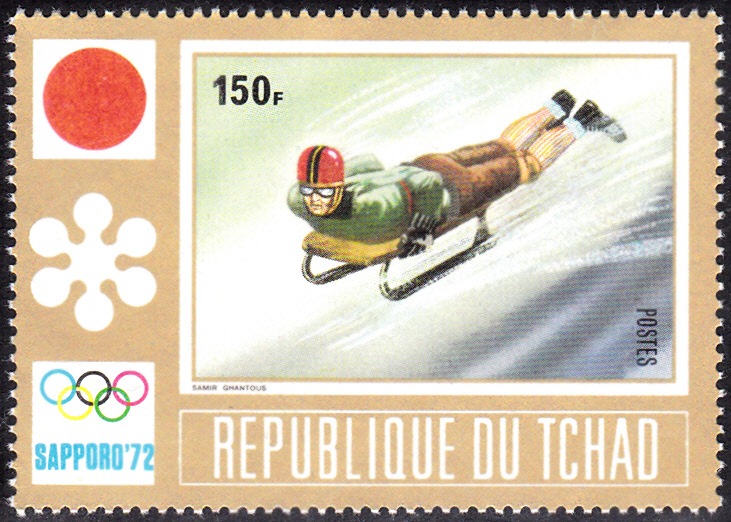 Auf dieser Marke aus dem Tschad (MiNr 504 A) wird ein Skeletonfahrer gezeigt.