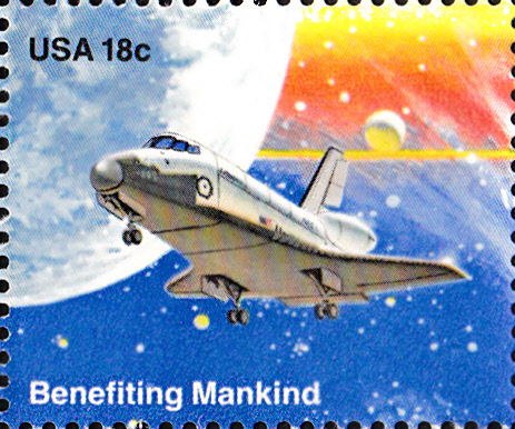 In einer Ausgabe "Erfolge der Raumfahrt" ist diese Marke (MiNr 1482) mit der Raumfähre Columbia etwa zwei Minuten nach dem Start. Die Marke zeigt den Moment der Abtrennung der beiden Feststoff-Zusatzraketen (SRB, Solid Rocket Booster).