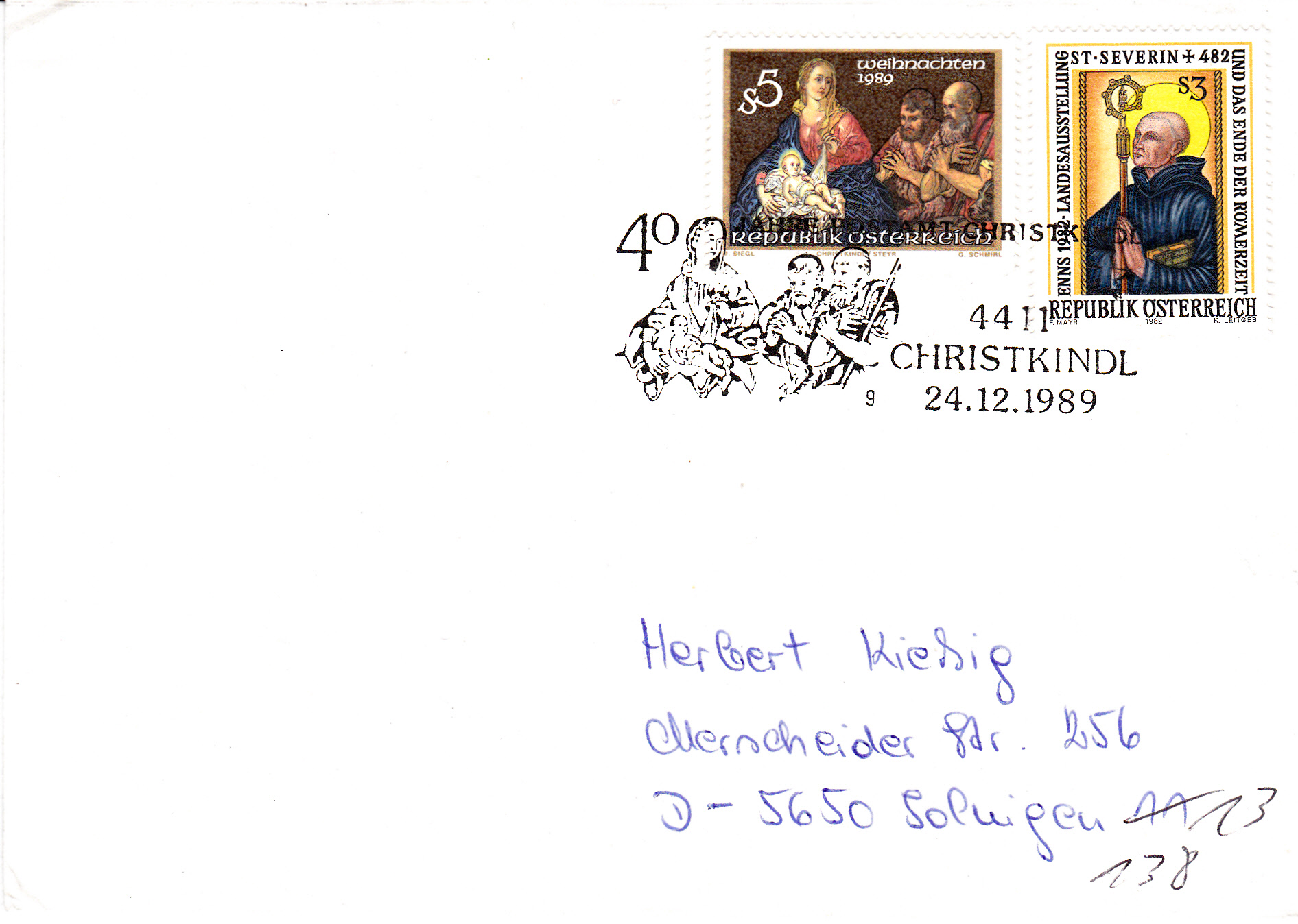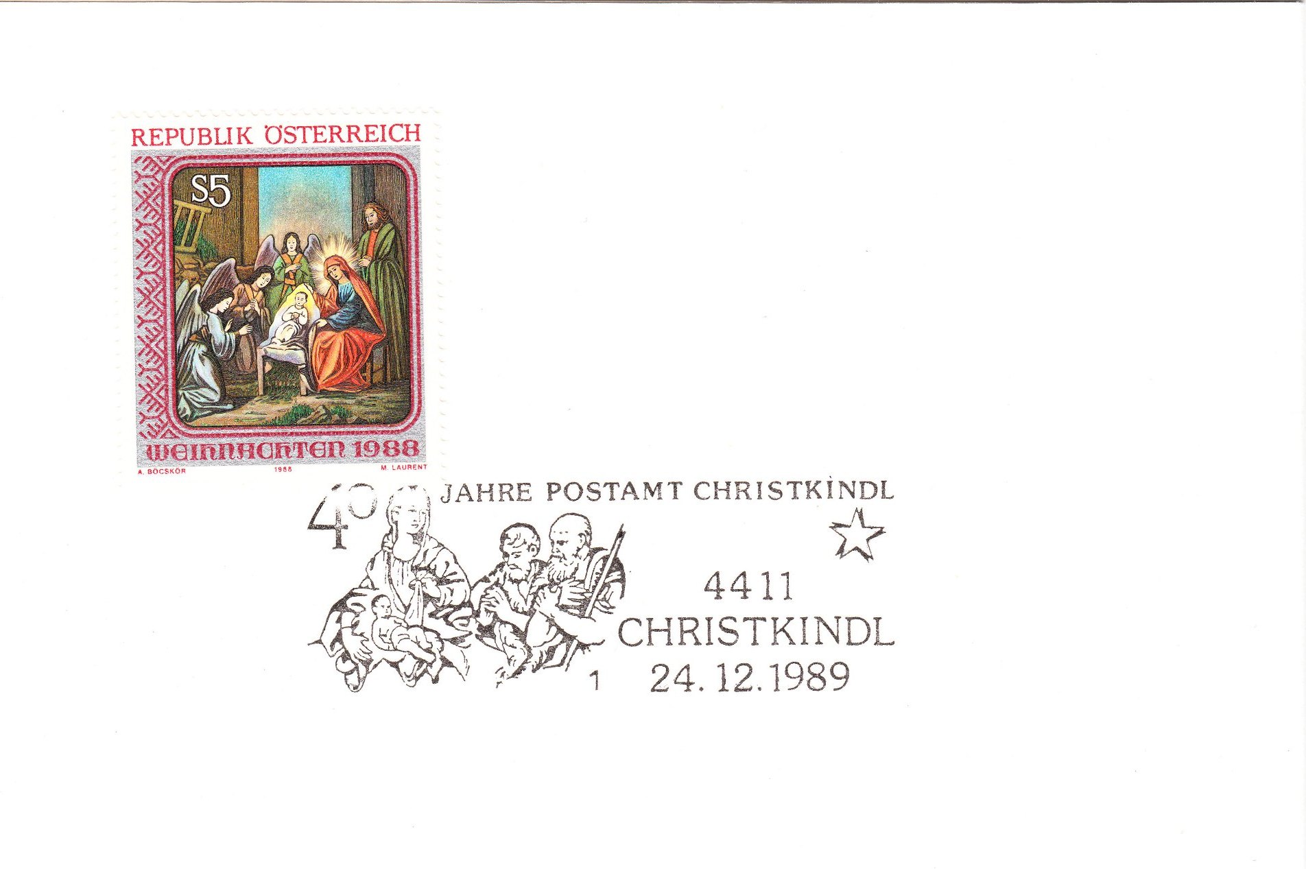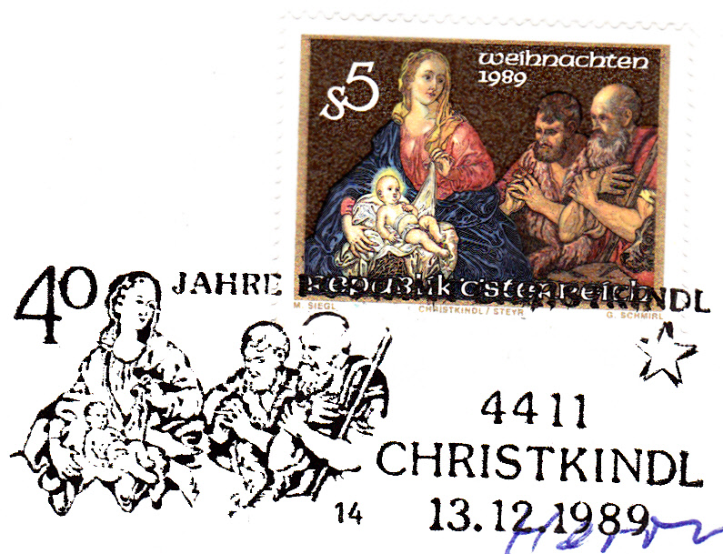 Dieser Sonderstempel vom 01.12.1989 zeigt als Motiv den inzwischen sehr selten einmal zu findenden ersten Sonderstempel aus CHRISTKINDL aus dem Jahre 1950: