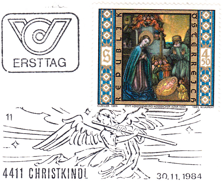 Der Sonderstempel "Christkindl" aus dem Jahre 1984 zeigt einen musizierenden Engel. Hier ein Abschlag vom 24.12.1984 mit der Kennziffer "1". Er stammt aus einer Weihnachtsklappkarte der Briefmarkenversandstelle der Österreichischen Post.