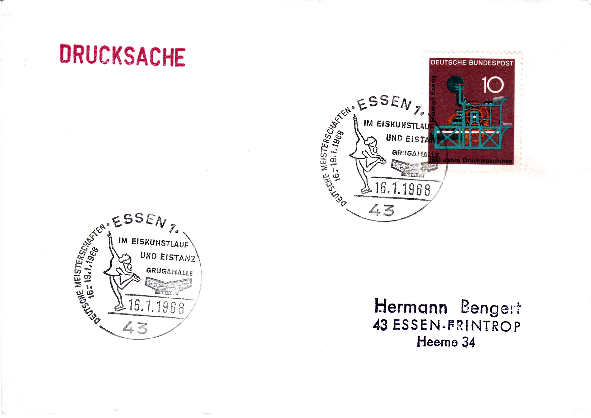 Sonderstempel aus Essen vom 16.1.1968 zu den Deutschen Meisterschaften im Eiskunstlauf und Eistanz vom 16.-19.1.1968 in der Grugahalle Essen.
